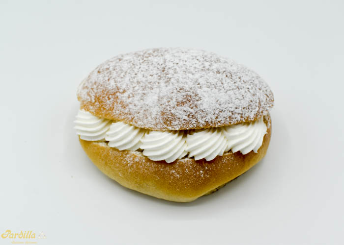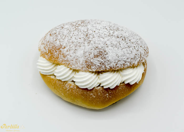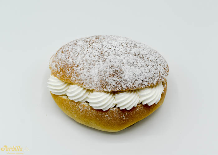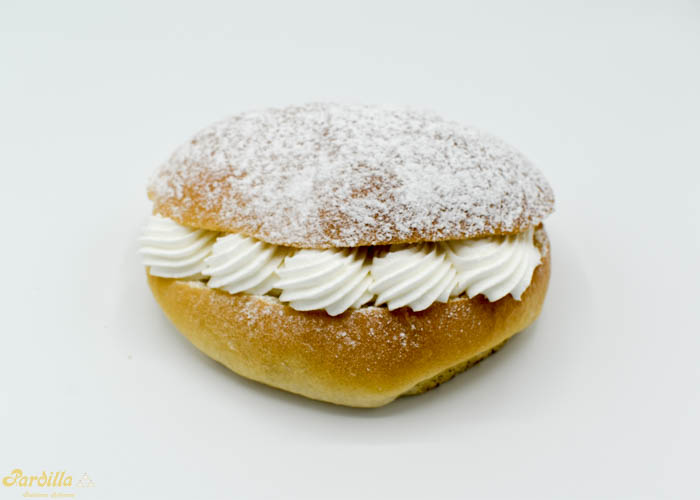 Nuestra especial masa brioche rellena de nata y decorada a base de azúcar glass.