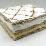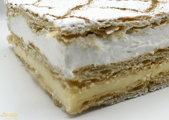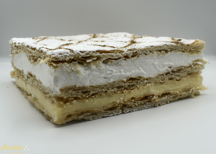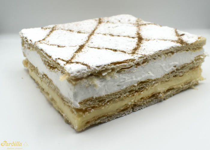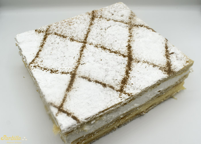 Finas capas de nuestro hojaldre artesano recubierto con nata y crema pastelera.Decorado con azucar glass.