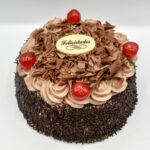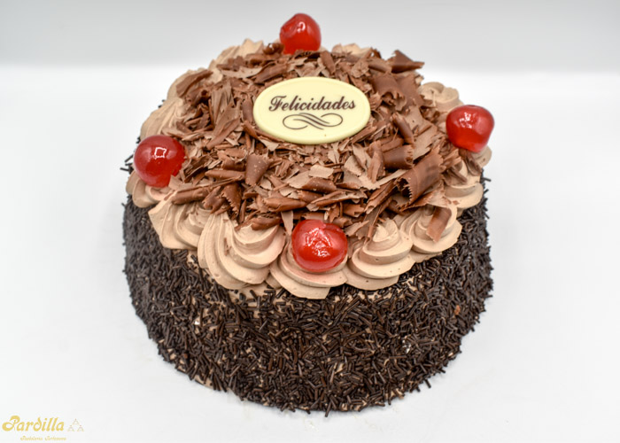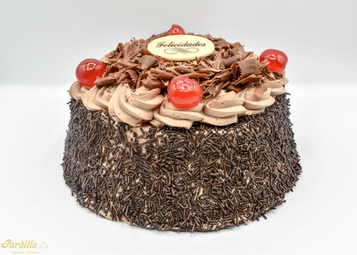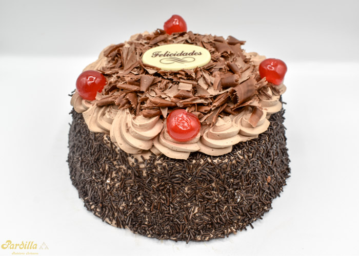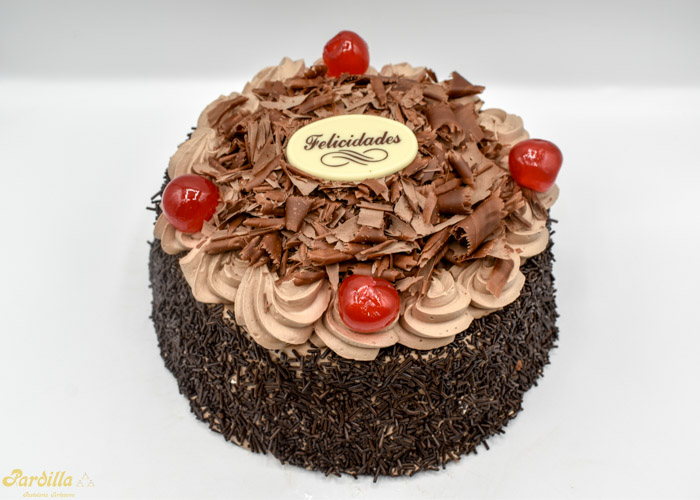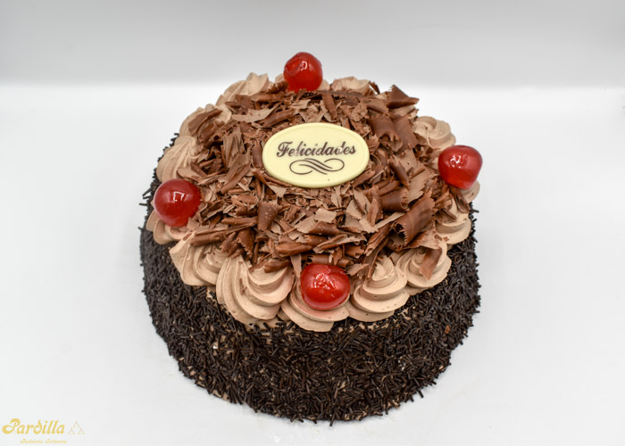 Bases de bizcochos blancos rellenos y recubierto de trufa negra decorado con fideos de chocolate, guindas y horajasca de chocolate belga negro o blanco